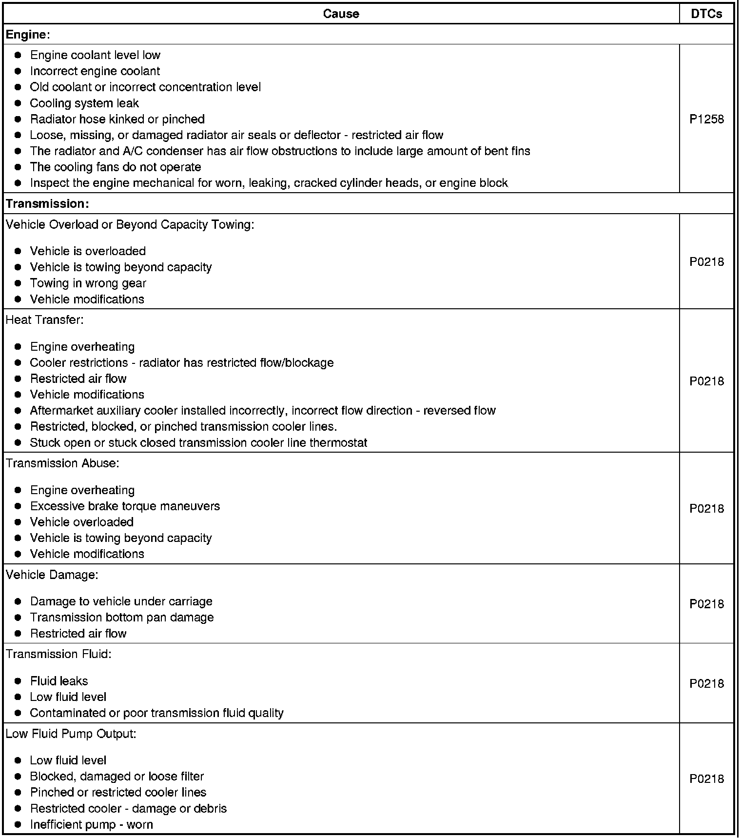 The primary source of heat in the transmission is the drive motor generators. The drive motor generators are cooled by the transmission fluid. Hot fluid exits the drive motor generators and flows to the transmission cooler supply line. The supply line connects to the cooler, which is in front of the radiator. The transmission fluid cooler pipe assembly is equipped with an internal thermostat that opens at 80°C (176°F) for optimum transmission operation and fuel economy. The transmission cooler pipe thermostat is part of the transmission fluid cooler pipe assembly, located near the left side of the radiator and is not serviced separately from the cooler lines, the fluid returns through the transmission fluid cooler pipe assembly and enters the lubrication circuits. After lubricating the internal components, the fluid returns to the oil pan. The transmission fluid temperature (TFT) sensor is located in the control solenoid (w/body and TCM) valve assembly and is not serviced separately. The driver information center (DIC), if equipped, will display "TRANSMISSION HOT - Idle Engine" when the TFT reaches 135°C (275°F). The TFT parameter on the scan tool should rise steadily to a normal operating temperature, and then stabilize. Ask about the customer's driving habits, trailer towing, etc. Ensure the engine cooling system is functioning normally.