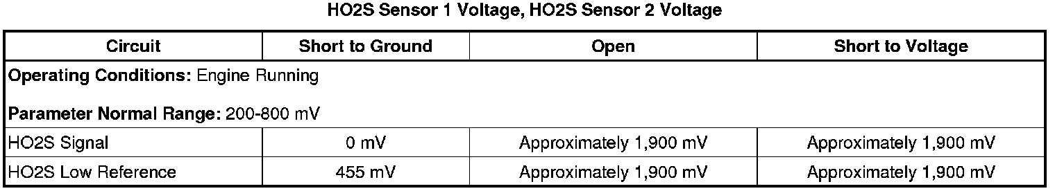 This ECM uses a bias voltage on the high and low signal circuits of the HO2S. The voltage measured between the high and low signal HO2S terminals is approximately 1,900 mV. The voltage measured between the low signal HO2S terminal and ground varies based on the temperature of the HO2S and will typically be between 0 and 1,000 mV, under normal operating conditions. The value of the high signal circuit when measured to ground will be approximately equal to the voltage measured between ground and the low signal circuit plus 1,900 mV.