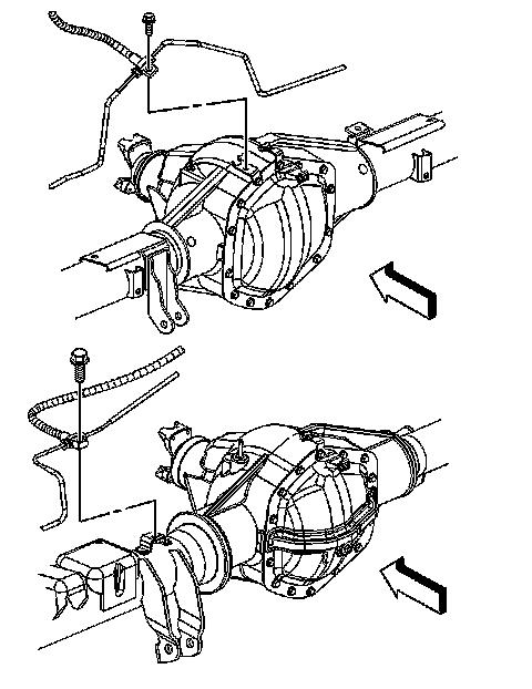 15. Remove the brake calipers. Refer to Rear Brake Caliper Replacement (JD9) Rear Brake Caliper Replacement (JD9)Rear Brake Caliper Replacement (J90, J96) Rear Brake Caliper Replacement (J90, J96)Rear Brake Caliper Replacement (J95) Rear Brake Caliper Replacement (J95).