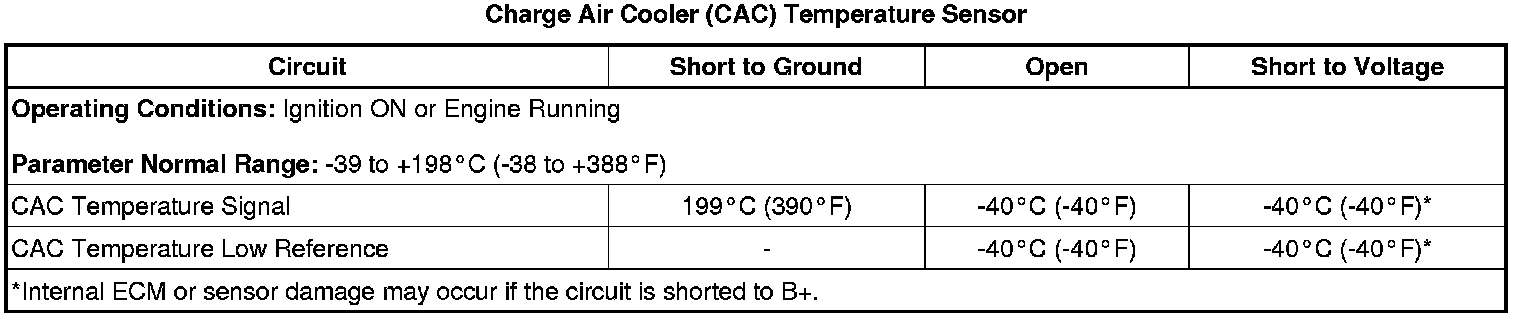 The CAC temperature sensor signal is warmer than 250°C (482°F) for longer than 5 s. This is equal to or less than 0.03 V on the CAC temperature sensor signal circuit as measured by the ECM.