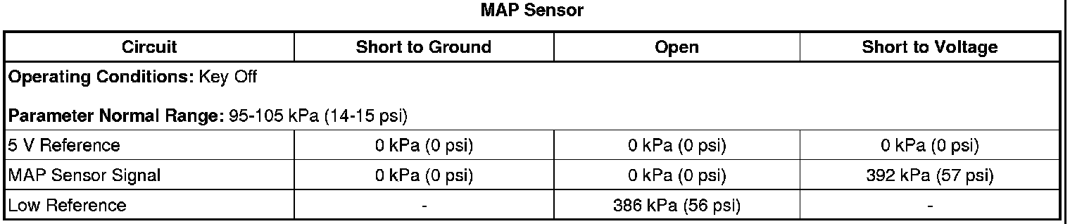 The ECM uses the MAP sensor to aid in diagnosis of the turbocharger performance. The highest manifold pressures occur when the turbocharger output is high. Manifold pressure can range from 58 kPa (8 psi) when pressures are low, to more than 240 kPa (34 psi) when pressures are high, depending on the BARO. The MAP sensor has a range of 43-360 kPa (6-52 psi).