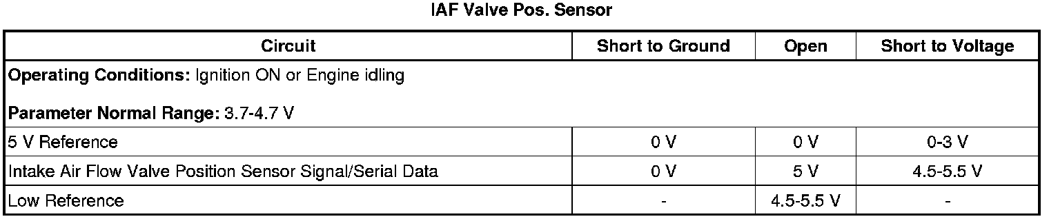 2. Engine idling, observe the scan tool IAF Valve Pos. Sensor voltage parameter. The reading should be between 3.7-4.7 V.