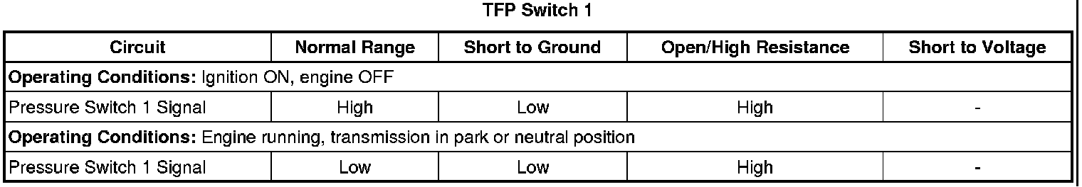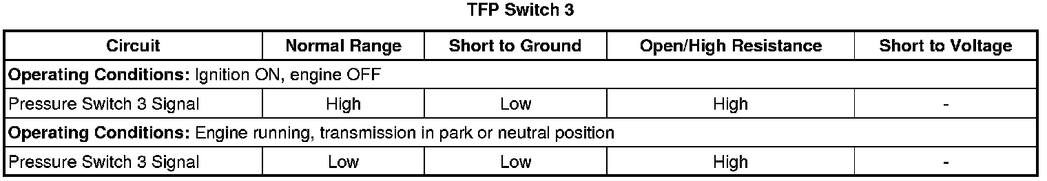 2. Engine running, command the transmission through the forward ranges with a scan tool. Verify the TFP Switch 1, TFP Switch 2, and TFP Switch 3 parameter states are correct for each forward range. Refer to Pressure Switch Manifold (PSM) Logic Pressure Switch Manifold (PSM) Logic.