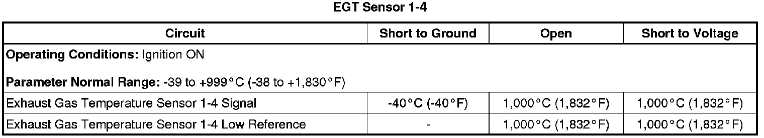 * Exhaust gas temperature sensors may fail intermittently while operating under extreme temperatures. Review the Freeze Frame Failure Records to verify the failure criteria.