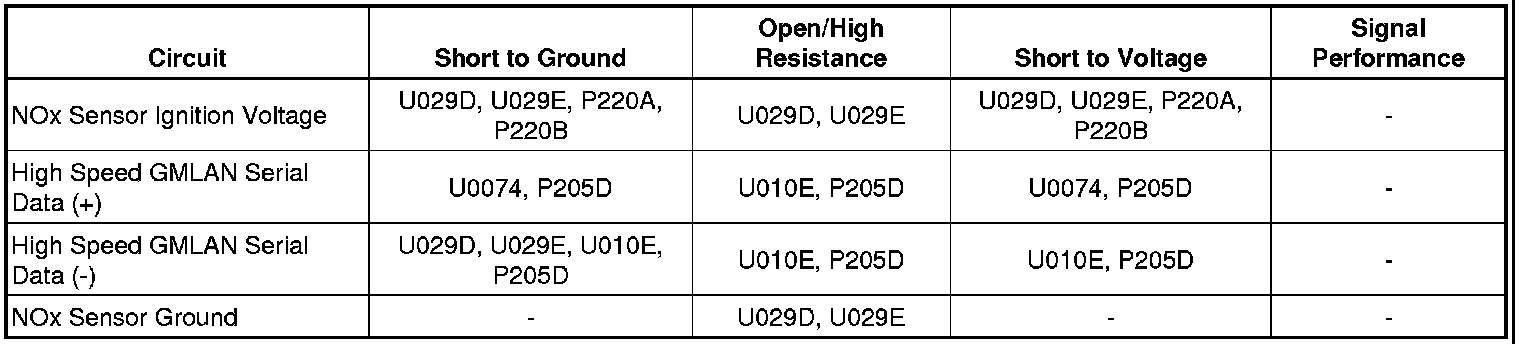 The smart NOx sensors consist of two components, the NOx module and the NOx sensor element that are serviced as a unit. A circuit or performance condition with a NOx sensor is detected by the NOx sensor module. The smart NOx sensor module communicates the condition to the ECM over the serial data line. The ECM sets a DTC when a serial data message is received from the NOx sensor module.