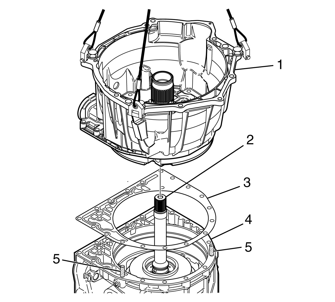 1. Install 2 M10 x 1.5 guide bolts (5) into the transmission case (4).