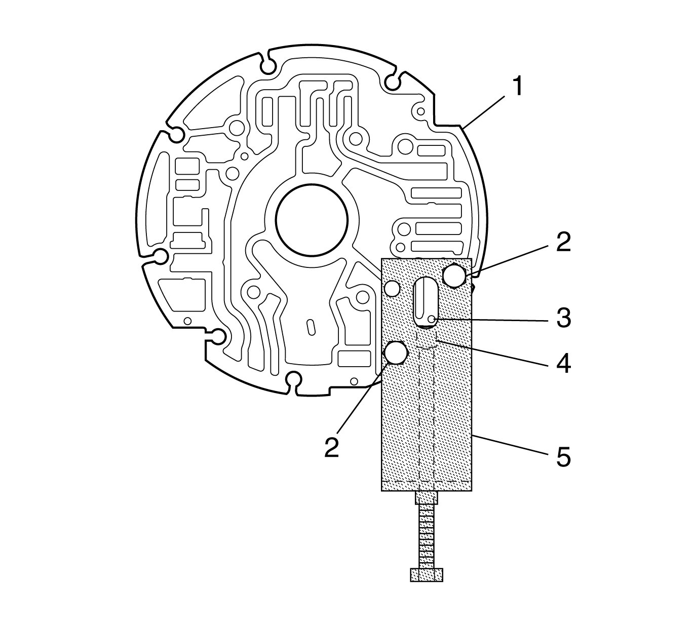 28. Remove the stop (5), the spring (4), and the TCC valve (3).