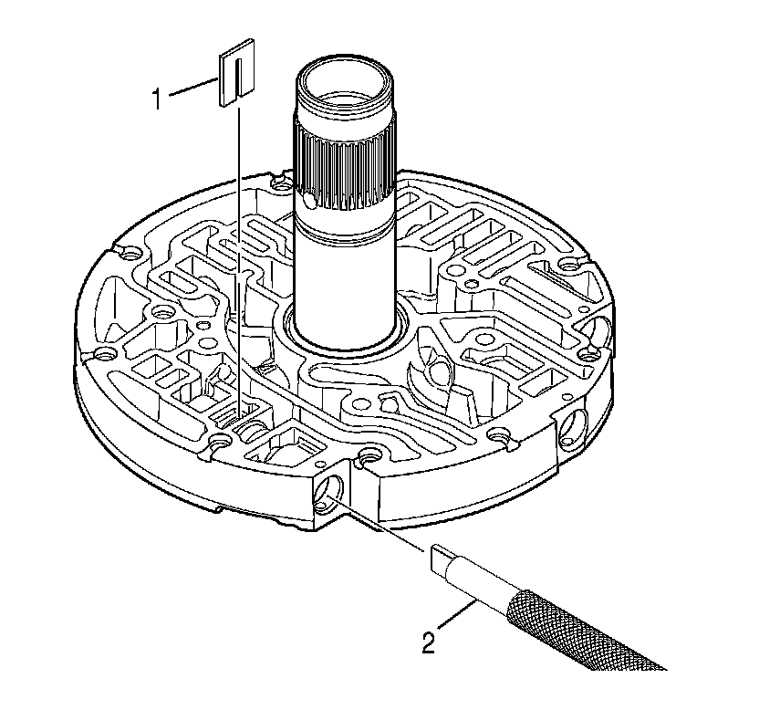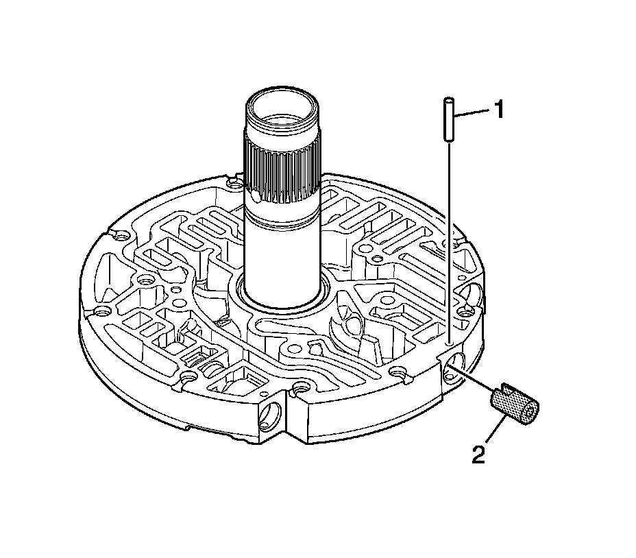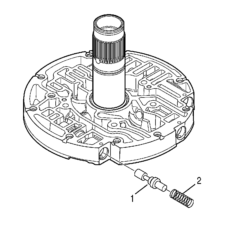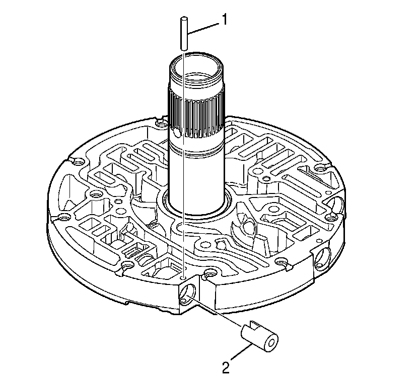 13. Using J 24459-5 - adapter (2), compress the 1-2-3-4 clutch backfill valve spring until the retaining pin (1) is loose.