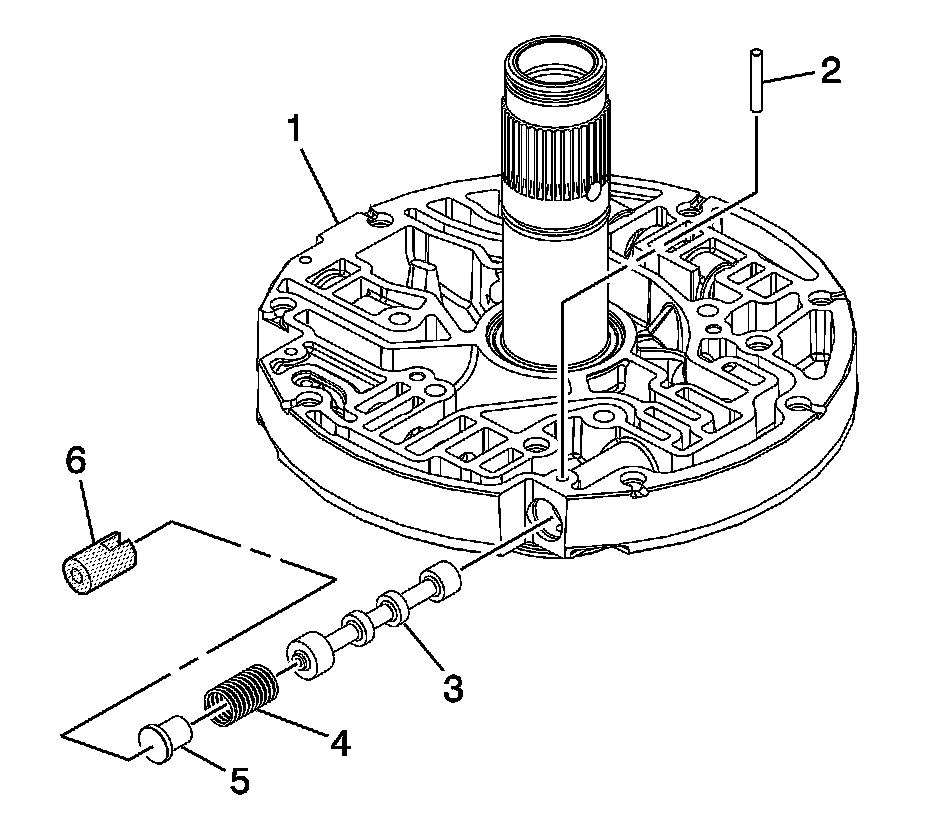 23. Using J 24459-5 - adapter (6), compress the torque converter clutch (TCC) valve spring until the retainer pin (2) is loose.