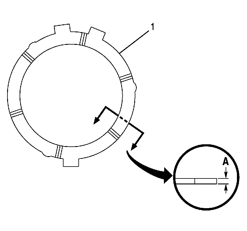 1. Measure the thickness of thrust washer (1) at dimension A.