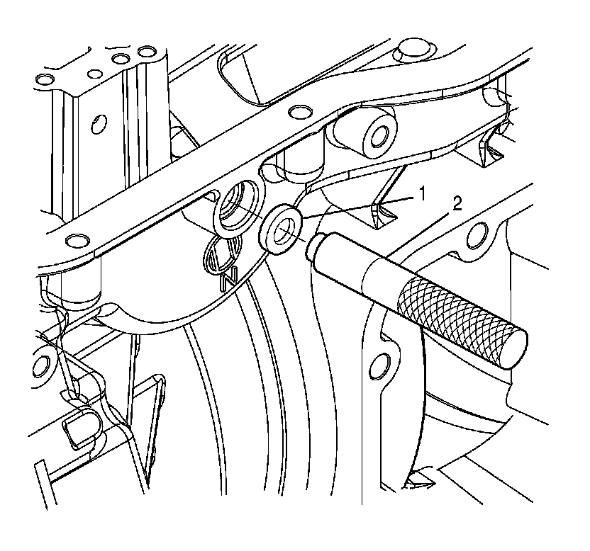 2. Using J 43909 - installer (2) , drive the manual shift shaft seal (1) into the transmission case.