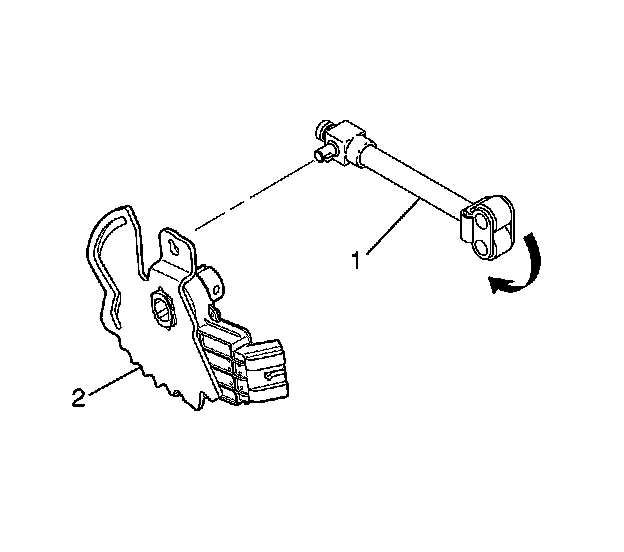 4. Install the nib of the park pawl assembly (1) through the keyhole in the detent lever/internal mode switch (IMS) assembly (2).