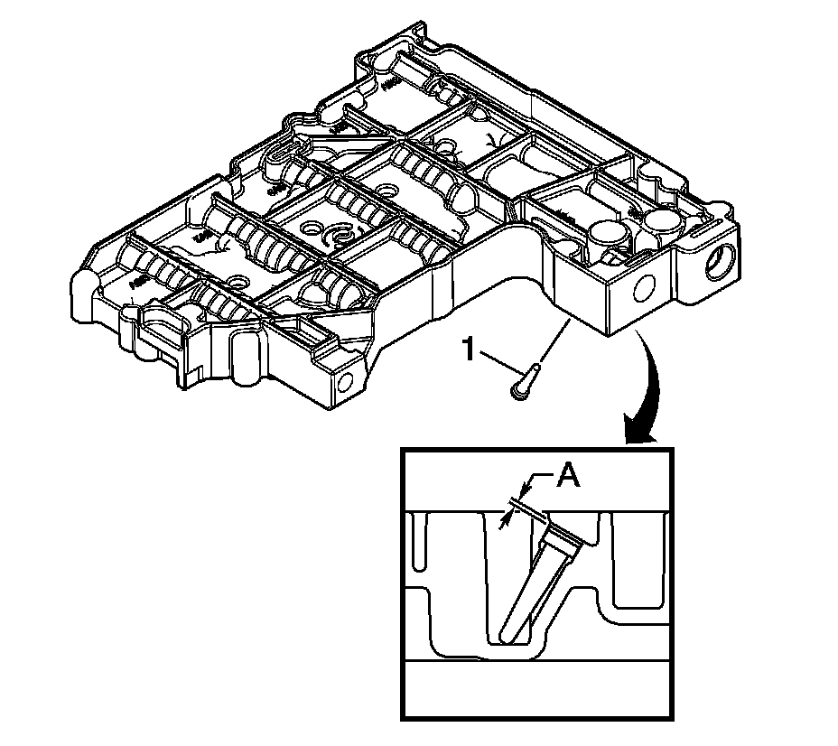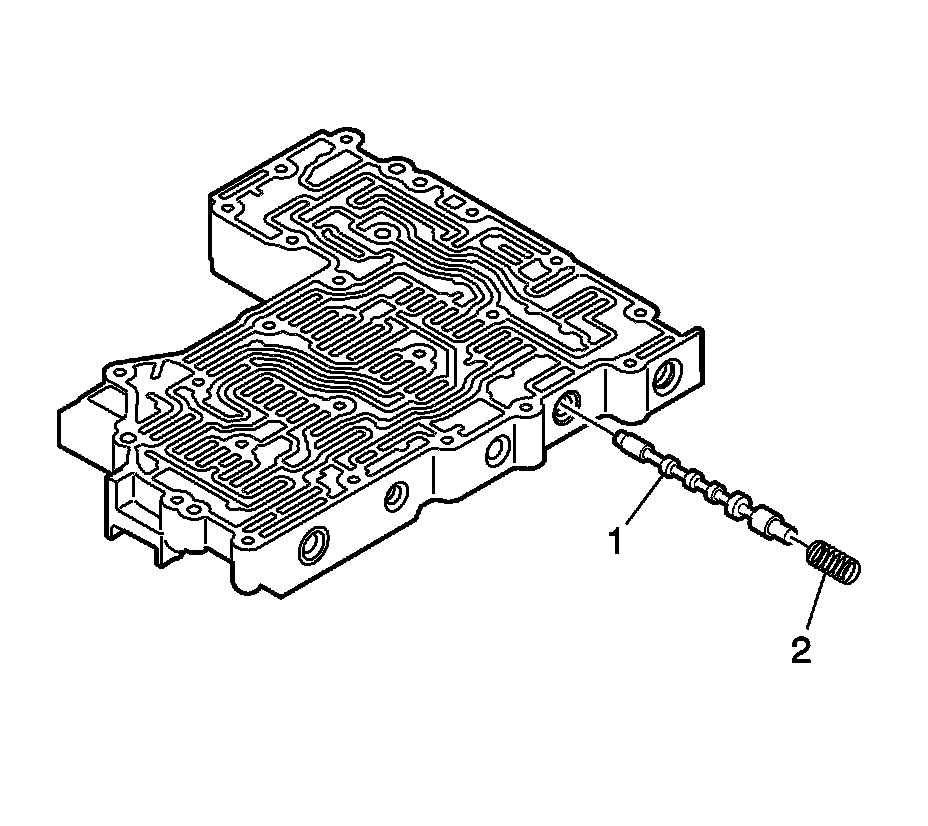 1. Using J 43773 - compressor (2), compress the shift valve 1 (SV1) spring until the retaining clip (1) is loose.