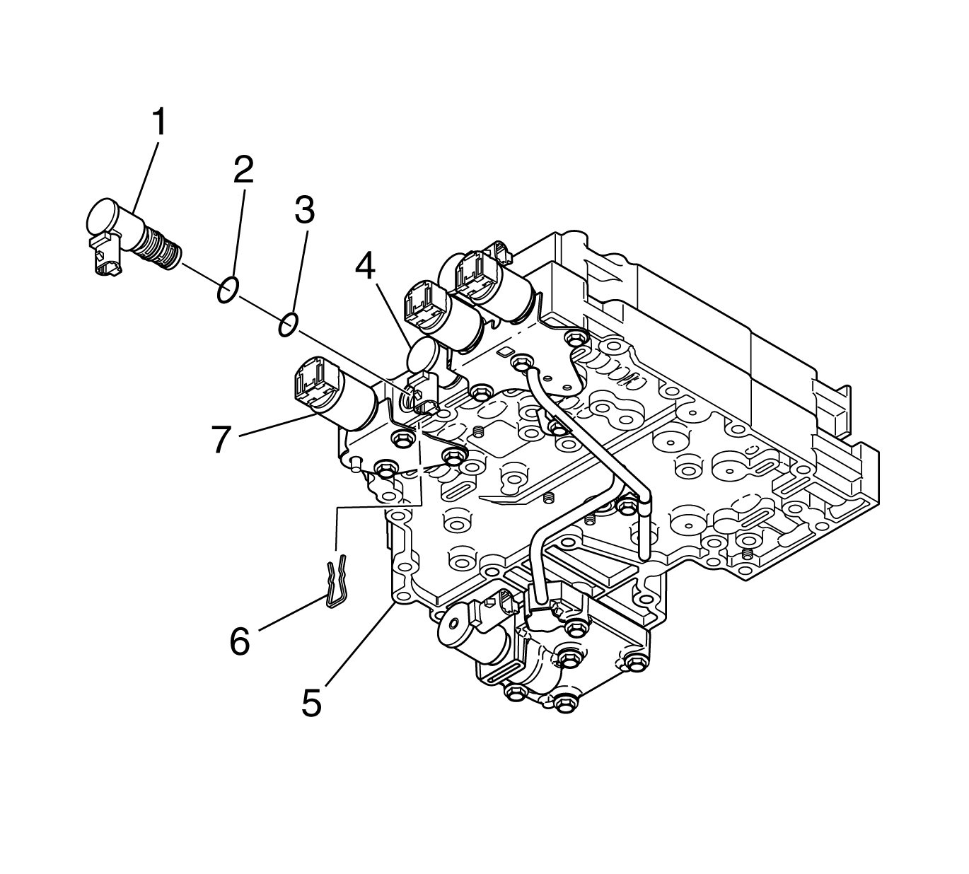 1. Obtain a new SS 2 (1), SS 3 (4), TCC PCS (7), or modulated main pressure solenoid. Install O-rings (2 and 3) and lubricate with clean transmission fluid. Push the new solenoid into the control valve assembly (5) with the wiring harness connector in the correct position.