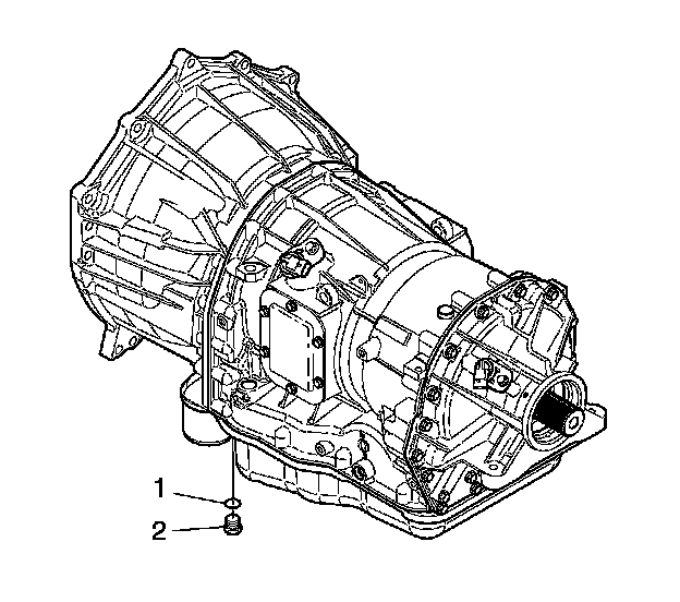1. Remove the pressure tap plug (2) and O-ring (1) on the bottom of the converter housing near the transmission external oil filter.