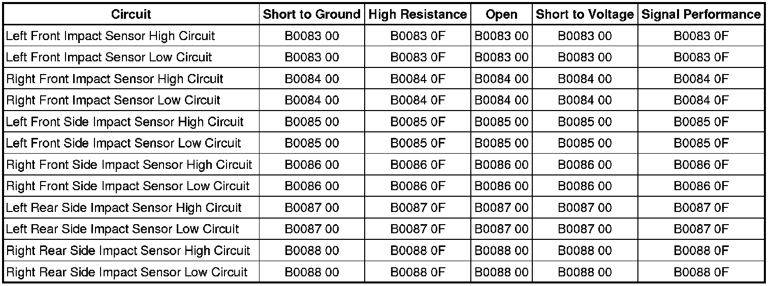 The impact sensors utilize a unidirectional 2-wire circuit. The impact sensors modulate current on the interface to send ID, state of health, and deployment commands to the inflatable restraint sensing and diagnostic module (SDM). The SDM serves as a power source and a ground for the impact sensor. When the ignition is turned ON and input power from the SDM is first detected, the impact sensor responds by performing internal diagnostics and sending an ID to the SDM. The SDM considers the ID to be valid if the response time is less than 5 seconds. The impact sensor continually communicates status messages to the SDM, which determines if a fault is present in the impact sensor circuit. When a fault is detected, the SDM may reset the impact sensor up to 2 times by removing and reapplying power to it. If the fault is still present, the SDM will set a DTC.