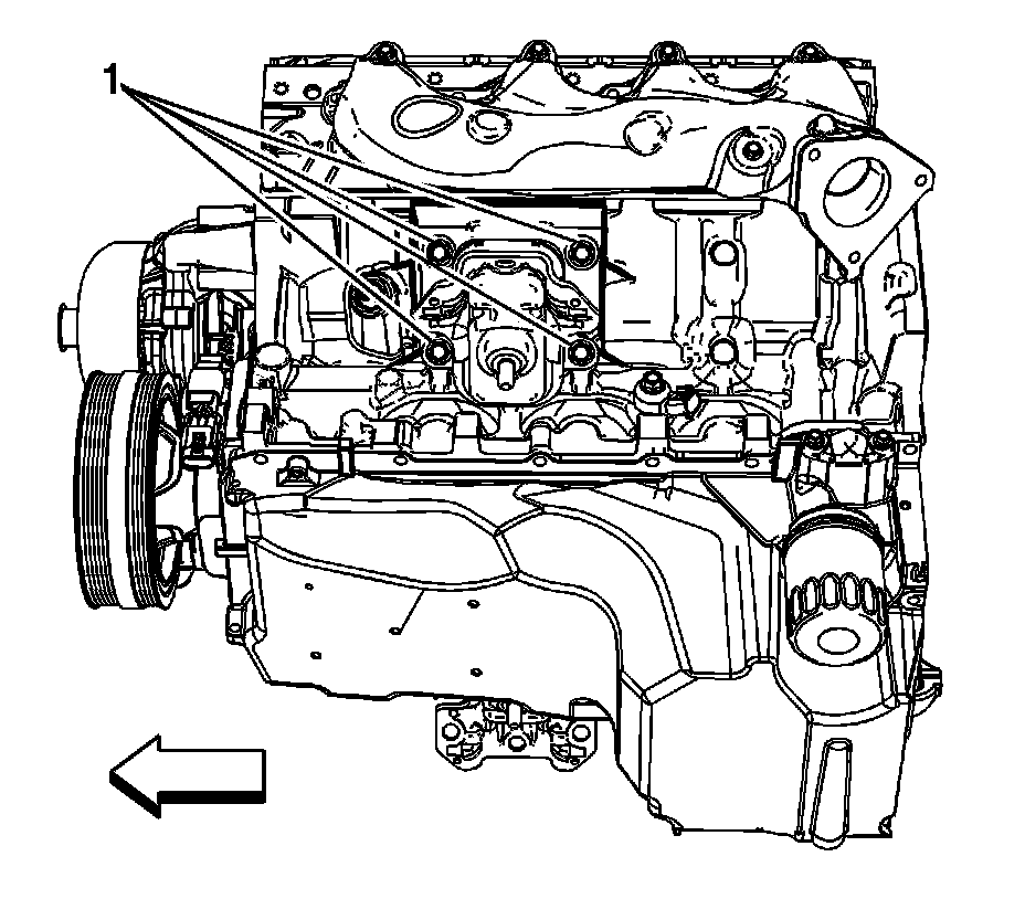 7. Install the engine mount to frame bolts (1) and tighten to 65 Nm (48 lb ft) starting with the middle bolt then either side bolt.
