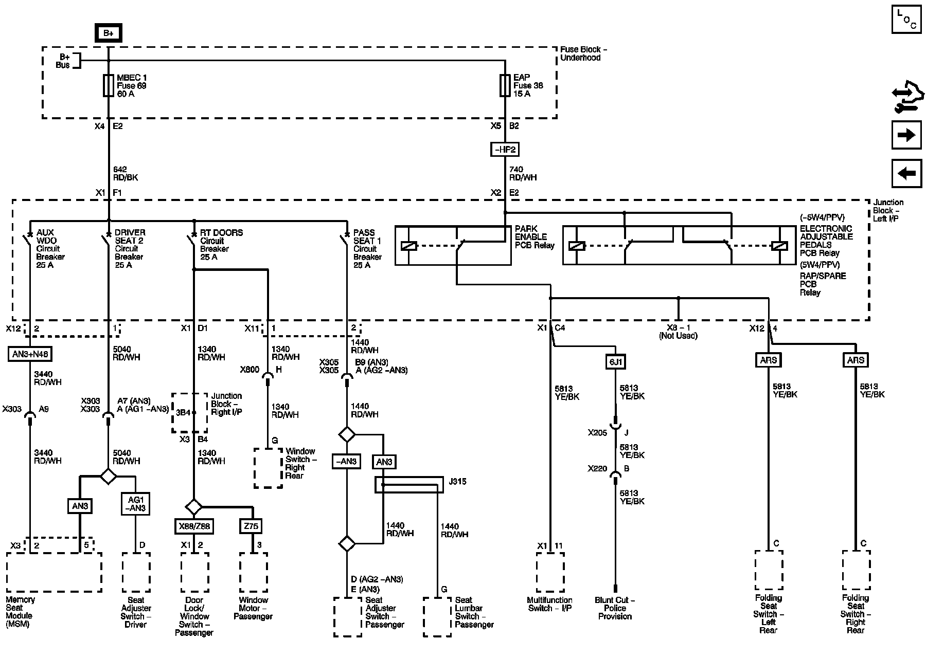 EAP and MBEC 1 Fuses; AUX WDO, DRIVER SEAT 2, PASS SEAT 1 and RT DOORS Circuit Breakers