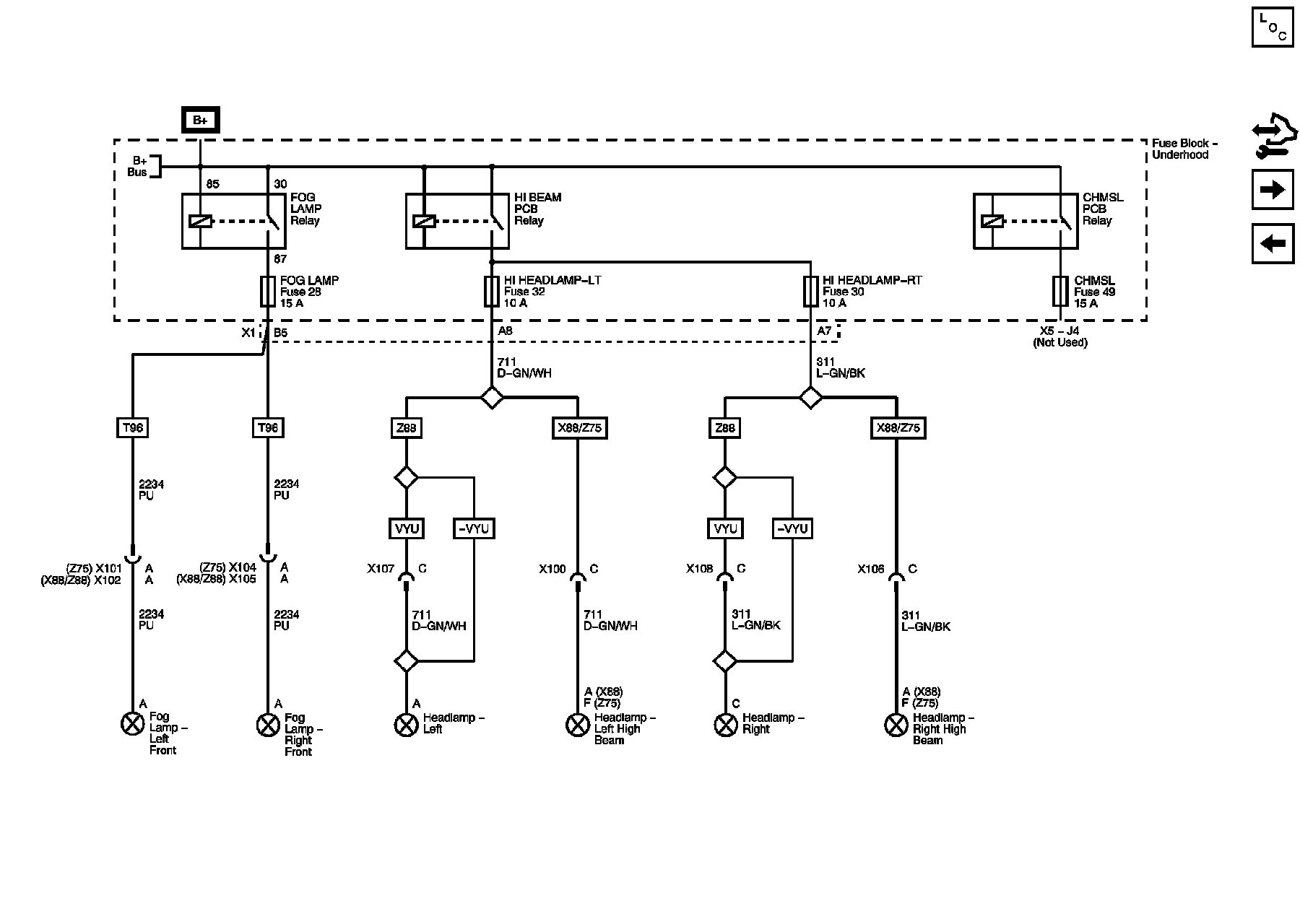 FOG LAMP, HI HEADLAMP - LT, and HI HEADLAMP - RT