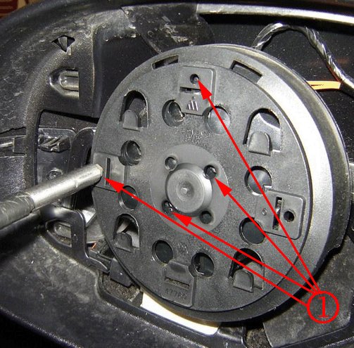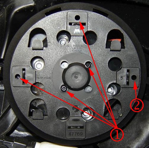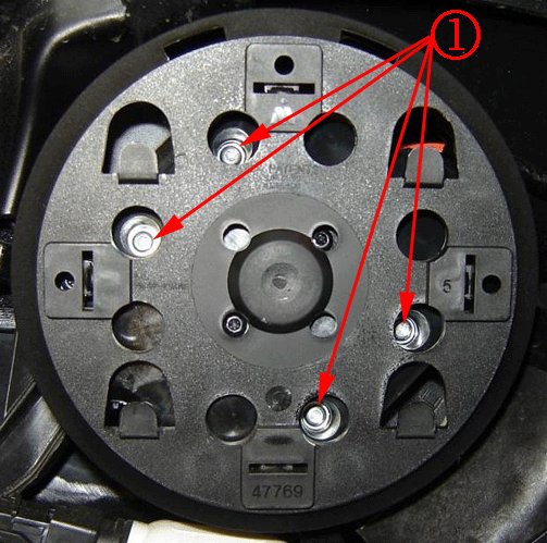 5. To access the motor/actuator housing cover retaining screws located along the outer edge (1), tilt the mirror glass adapter plate inward toward the motor/actuator housing as appropriate.