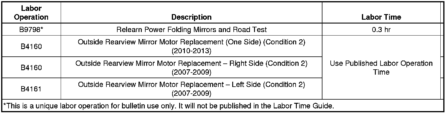 1. Cycle the mirrors through three complete power fold and unfold events. This will cause a relearn of the mirror positions and a reset of the power fold mechanisms.