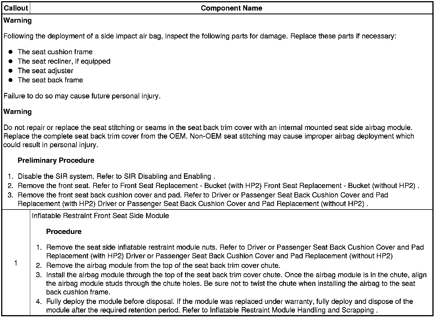 Driver or Passenger Seat Side Inflatable Restraint Module Replacement