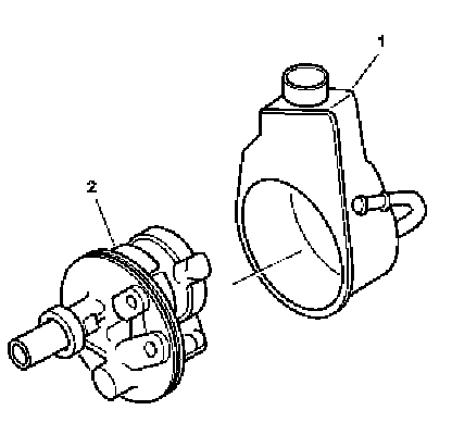 6. Separate the power steering fluid reservoir (1) and the power steering pump (2).