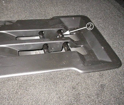 1. Visually inspect the carpet escutcheon to see if it is correctly seated to the floor strikers. An improperly seated escutcheon (2) is shown. There are three escutcheons for the third row. Inspect each escutcheon.