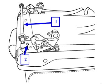 1. With the seat in the tumbled (folded forward) position, visually inspect to determine if there is contact (1) between the metal seat roller bar and the plastic carpet escutcheon.