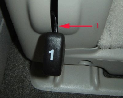 1. Inspect the seat back release lever for freedom of movement and sufficient clearance to the seat trim. The release lever shown does not have sufficient clearance (1) to the trim.