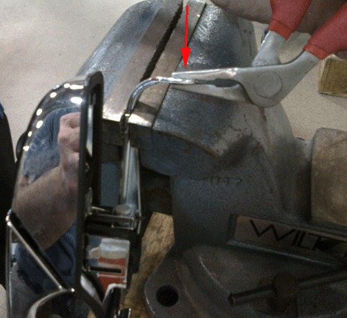 12. Carefully secure the lock release arm of the handle in a bench vise; ensure the handle finished surfaces and mounting gasket are not damaged.