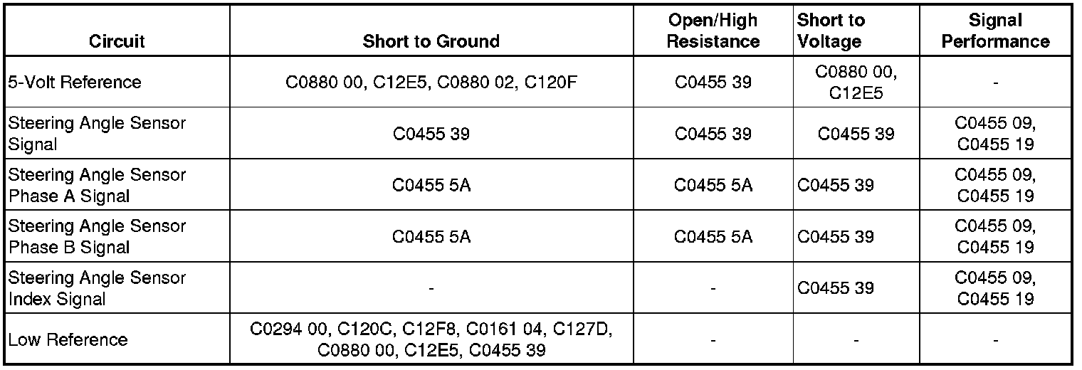 The EBCM detects a short to voltage, short to ground or an open/high resistance on one of the steering angle sensor circuits.