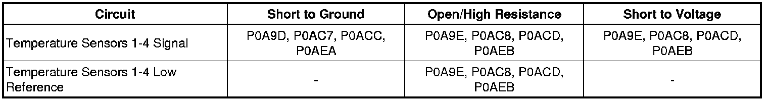 * Test the resistance across each temperature sensor 5 V reference and low reference circuits. Refer to Temperature Versus Resistance Temperature Versus Resistance.
