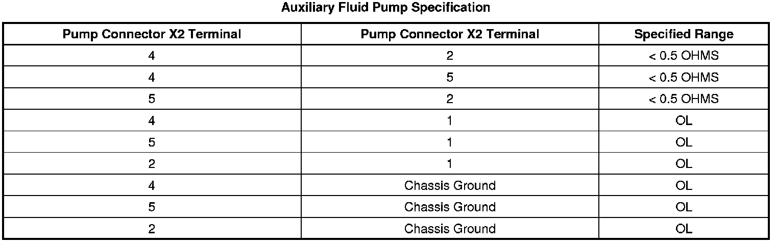 3. Using the Auxiliary Fluid Pump Specification table listed below, test the resistance between the X2 circuits of the pump connector as indicated.