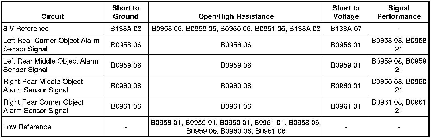 Voltage seen on the object alarm sensor signal circuit is greater than 11.5 V or the object alarm sensor is not grounded.