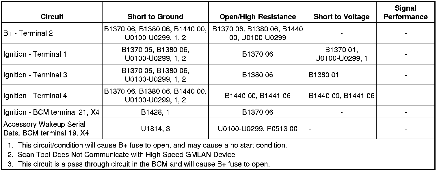 * BCM senses an open or short to voltage on the off/run/crank circuit when both ignition accessory/run and ignition run/crank parameters are active.