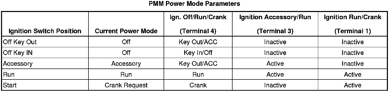 The vehicle power mode master (PMM) is the body control module (BCM). The ignition switch is a low current switch with multiple discrete ignition switch signals to the PMM for determination of the power mode. The PMM receives the ignition switch signals, and additionally a reference voltage signal from the BCM, through the ignition switch, and back to the BCM. There are redundancies within the PMM system that can allow operation of certain subsystems when there are faults in the ignition switch circuits. Other information such as serial data input from other modules and DTCs is also used to determine what power mode signals and information is transmitted by the PMM. The BCM logic uses all this information to identify the operator's desired power mode and activate specific discrete signals, and serial data messages for the operation of different subsystems as necessary. Other modules which have switched voltage inputs may operate in a default mode if the PMM serial data message does not match what the individual module can detect from its own connections.
