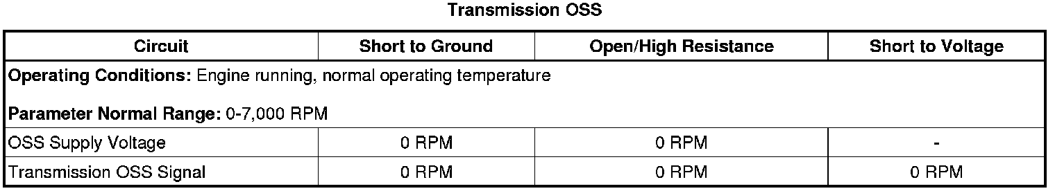 2. Operate the vehicle at 16-32 km/h (10-20 mph). Verify with a scan tool the Transmission OSS parameter varies with the vehicle speed and there are no spikes or dropouts.