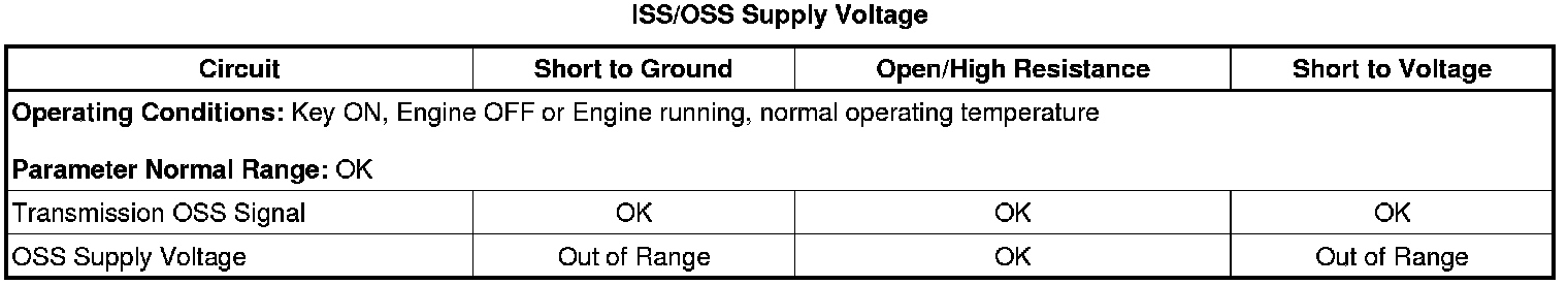 1. Ignition ON, verify with a scan tool the transmission ISS/OSS Supply Voltage parameter displays OK.