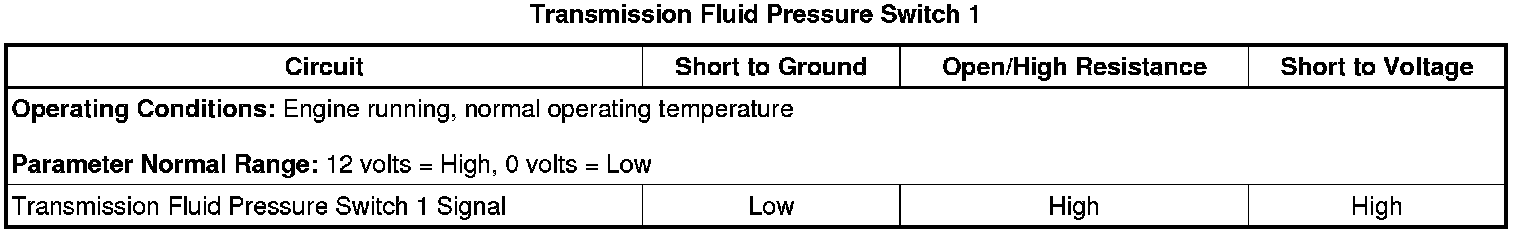 3. Verify the TFP Switch 1, TFP Switch 3, TFP Switch 4, and TFP Switch 5 parameter states are correct for each forward range with the gear select lever in Drive, using the scan tool to command all forward ranges. Refer to Transmission Fluid Pressure Switch Logic Transmission Fluid Pressure Switch Logic