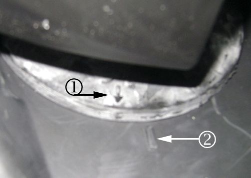 This condition may be caused by incorrect alignment of the pass-through grommet, located on the steering column I-Shaft. Due to the shape of the hole in the dash, the grommet must be aligned properly. The alignment arrow (1) on the rubber grommet should align with the line (2) on the dash mat. This can be seen from inside the vehicle, directly behind the brake pedal.