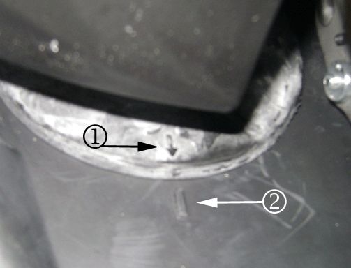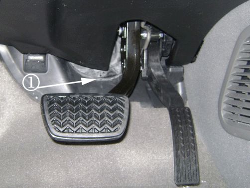 2. Locate the arrow and line marks by the brake pedal (1).