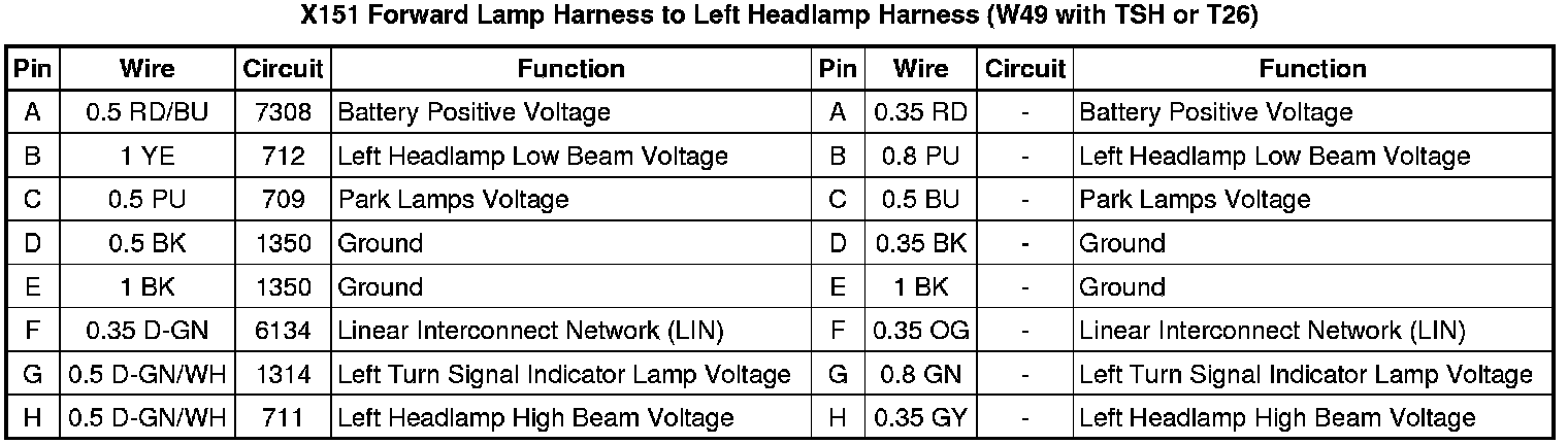 X151 Forward Lamp Harness to Left Headlamp Harness (W49 with TSH or T26)