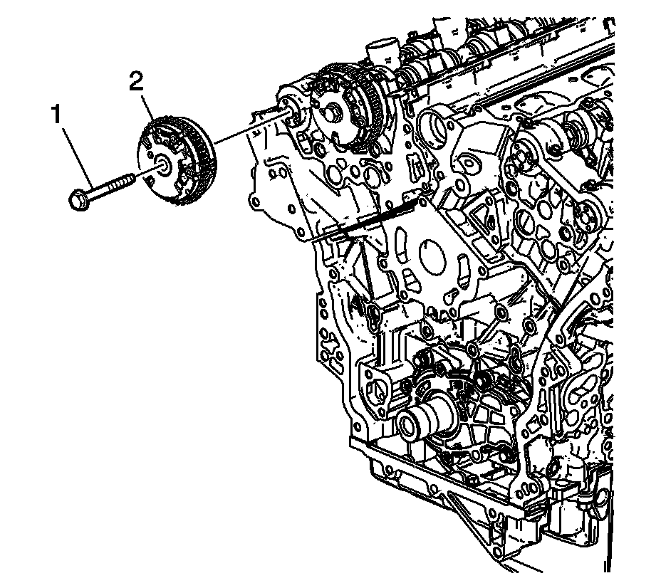 4. Apply a liberal amount of lubricant to the back of the camshaft position actuator (1) and front of the camshaft bearing cap (2). Refer to Adhesives, Fluids, Lubricants, and Sealers Adhesives, Fluids, Lubricants, and Sealers for recommended lubricant.