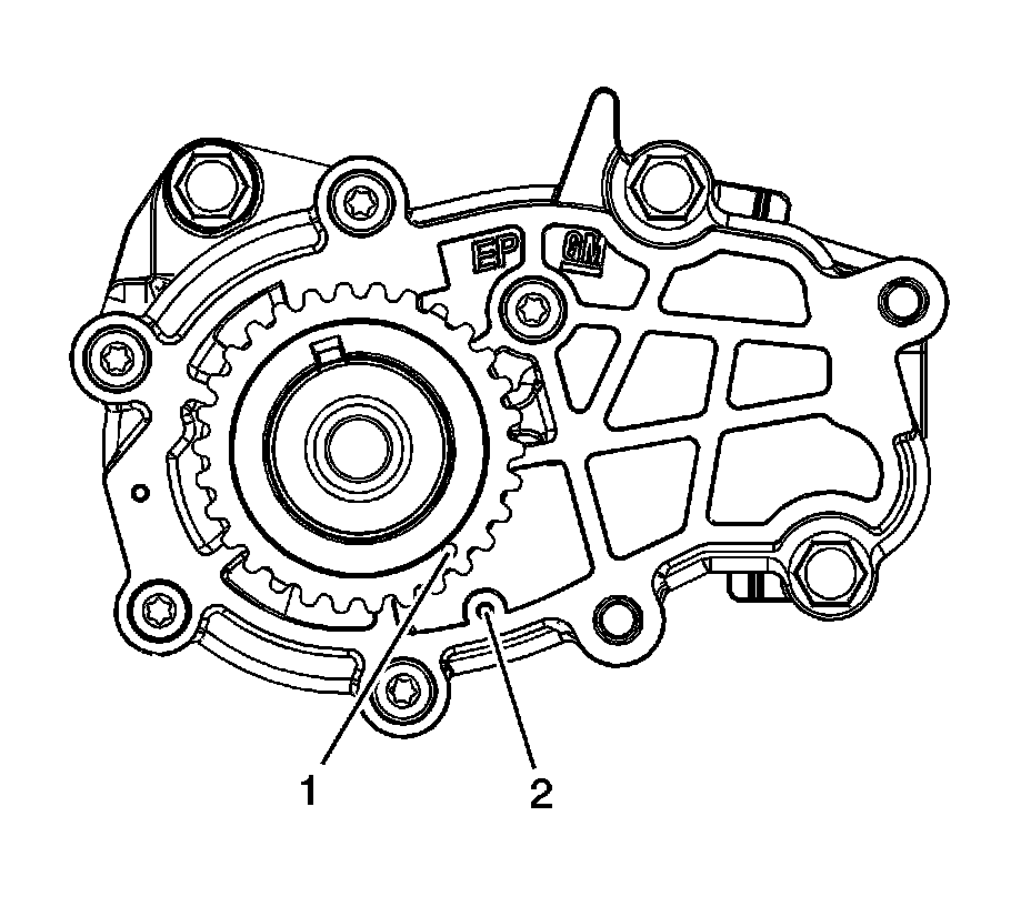 5. Ensure the crankshaft is in the stage one timing position with the crankshaft sprocket timing mark (1) aligned to the stage one timing mark on the oil pump cover (2) using the EN-48589 - socket. Refer to Timing Chain Alignment Diagram Locations.