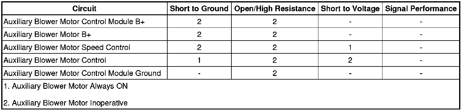 • If the test lamp is always OFF, test the control circuit terminal B for a short to voltage or an open/high resistance. If the circuit tests normal, replace the auxiliary blower motor control module.