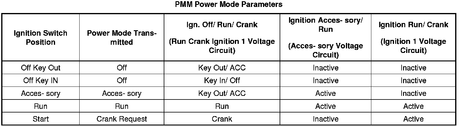 The PMM receives ignition switch signals to identify the operators desired power mode. The PMM Power Mode Parameters table below illustrates the correct state of these input parameters (circuits) in correspondence to the ignition switch position: