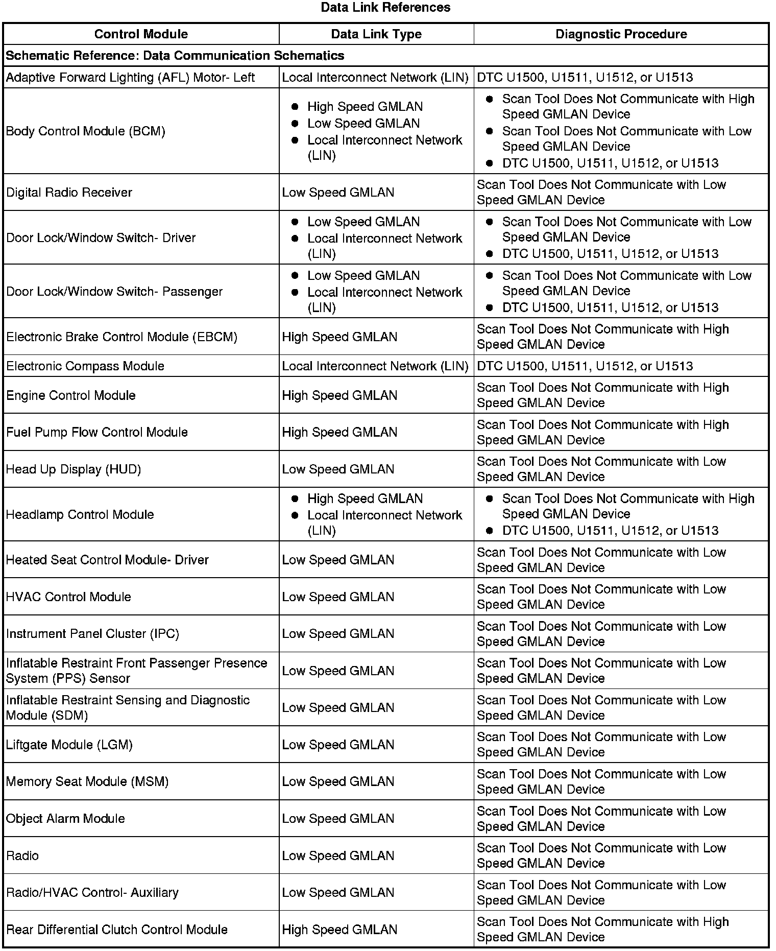 This table identifies which serial data link that a particular control module uses for in-vehicle data transmission. Some control modules may use more than one data link to communicate. Some control modules may have multiple communication circuits passing through them without actively communicating on that data link. This table is used to assist in correcting a communication malfunction. For the description and operation of these serial data communication circuits refer to Data Link Communications Description and Operation Description and Operation.