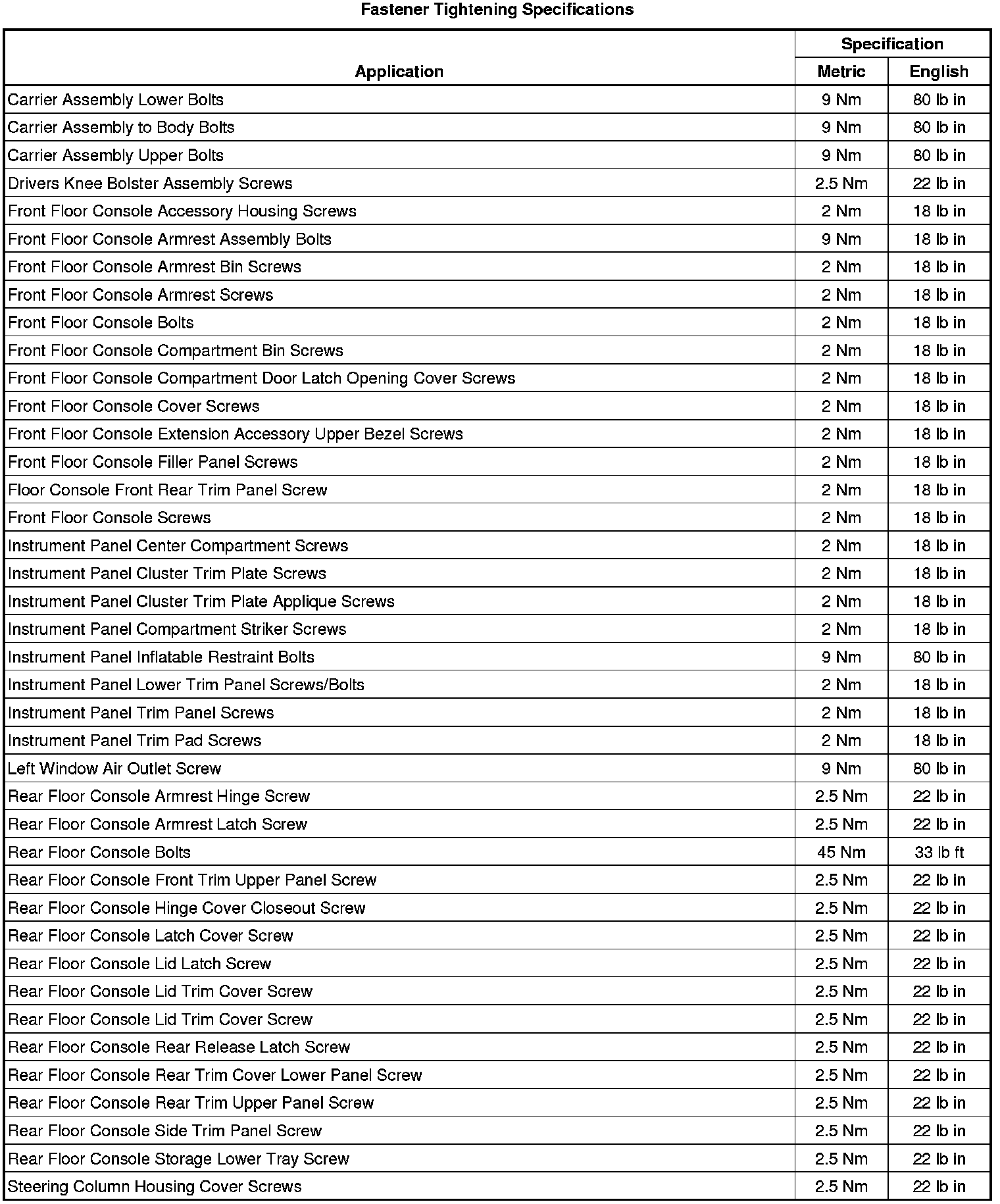 Fastener Tightening Specifications