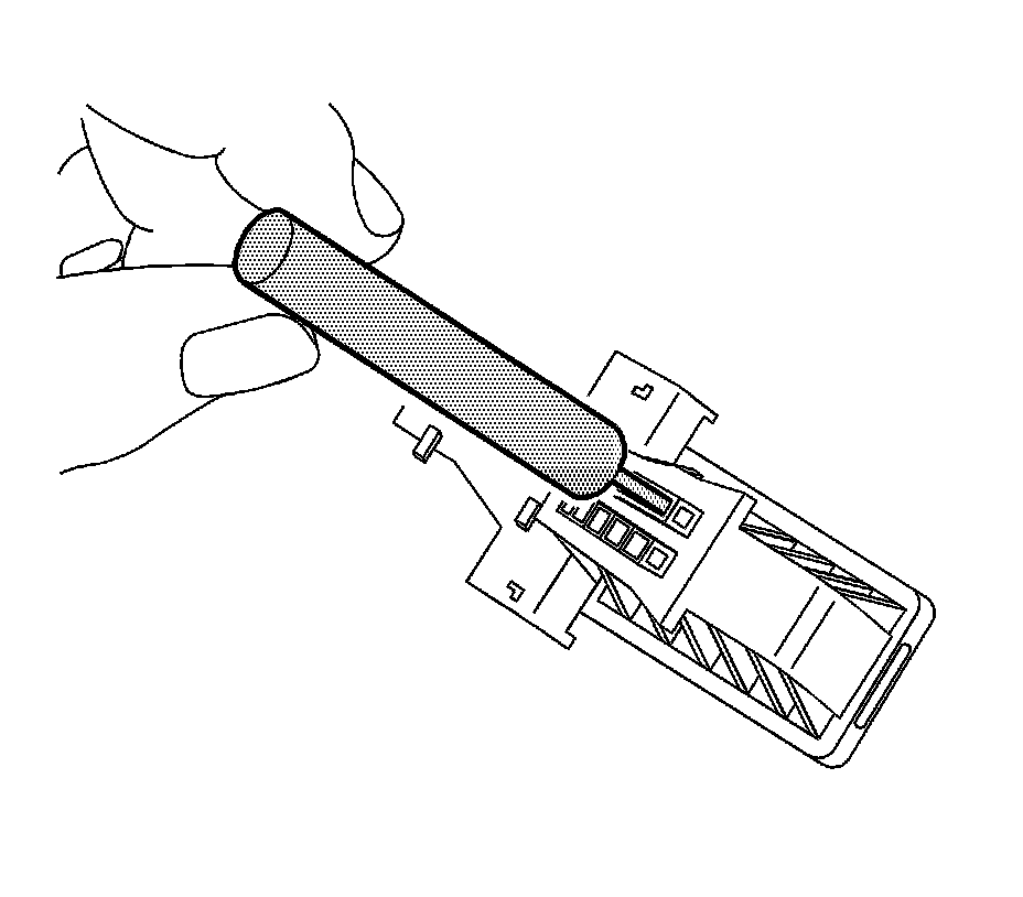 9. Using terminal release tool J-38125-556, press the prongs into the holes on each side of the terminal to be removed to release the lock tabs and pull the terminal out of the connector body.